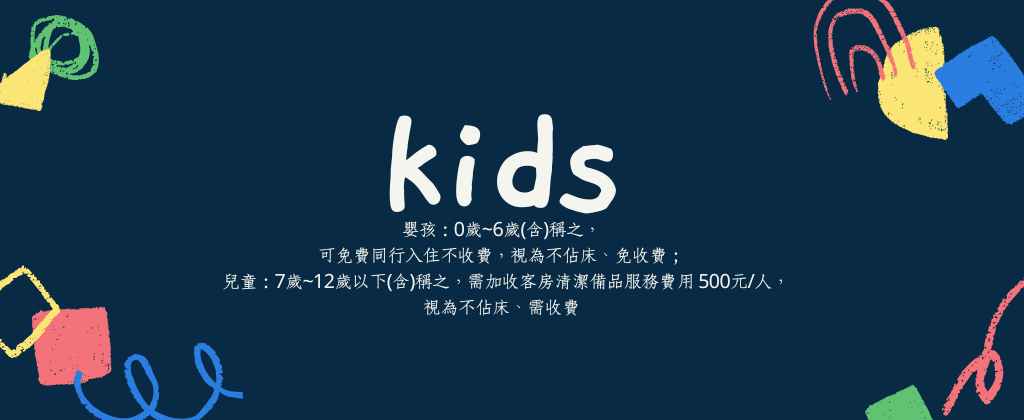 - 兒童:7歲~12歲以下(含)稱之,需加收客房清潔備品服務費用 500元/人,視為不佔床、住宿需收費;若超出預訂之房型人數須收接駁費。